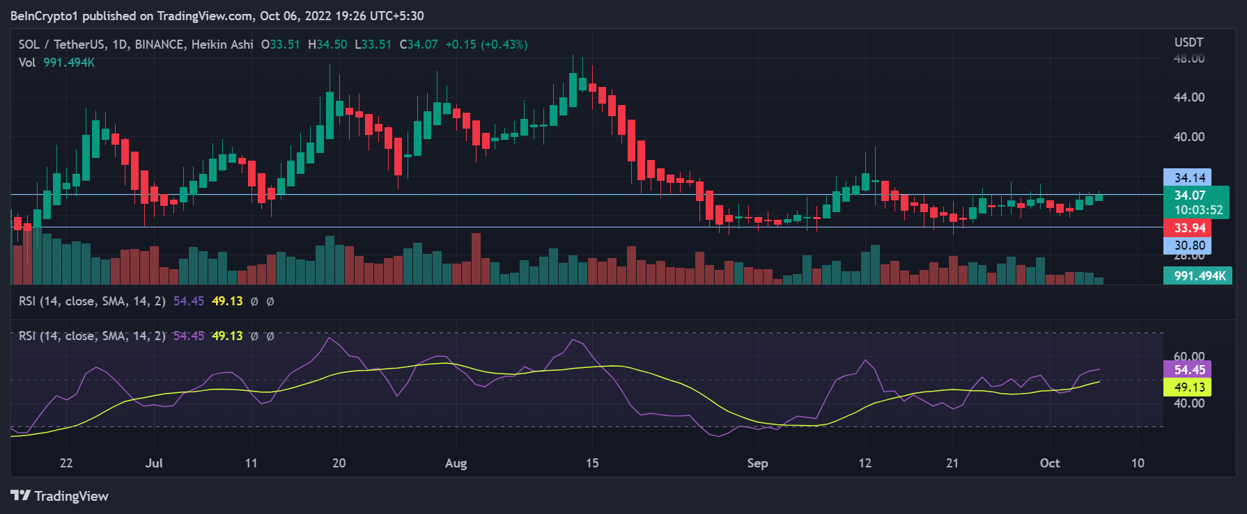 The Oct. 1 outage hindered the coin’s short-term bullishness pulling the price down to $31.70, however, recovery from that mark was charted over the last two days as SOL’s price appreciated by close to 5%.