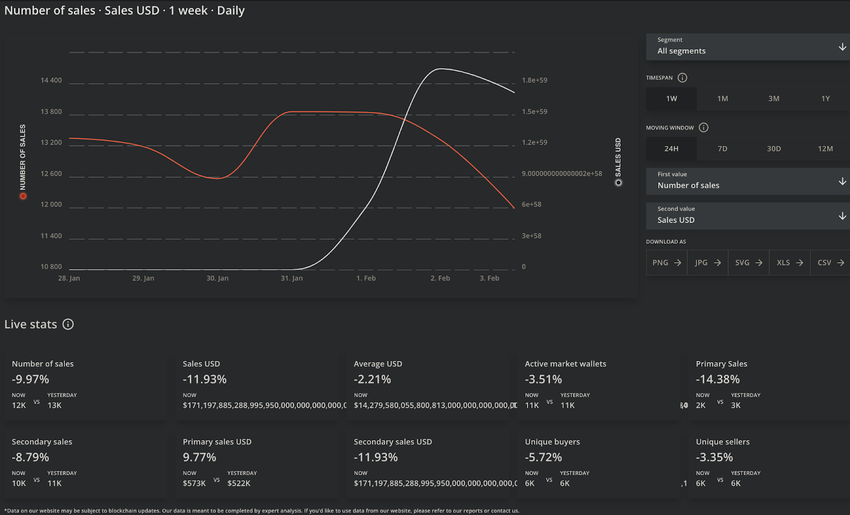 The number of non-fungible token sales rose over the week to 13,800, before sinking back below 12,000 coming into Feb. At press time, there was an error on NonFungible’s site that projected sales multiple orders of magnitude higher than any prior. The website attributed these sales to Axie Infinity, its top collection for the week. However, the Axie token is actually 5% down in the past seven days, according to BeInCrypto data.