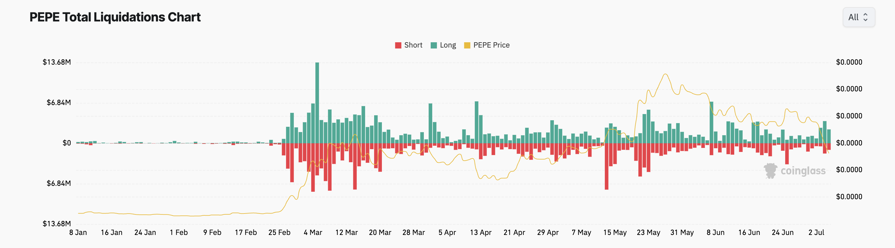 The value of the Solana-based frog-themed meme coin Pepe (PEPE) has dropped by 36% during the week in review. This has led to the liquidation of many long positions in the token’s derivatives market.