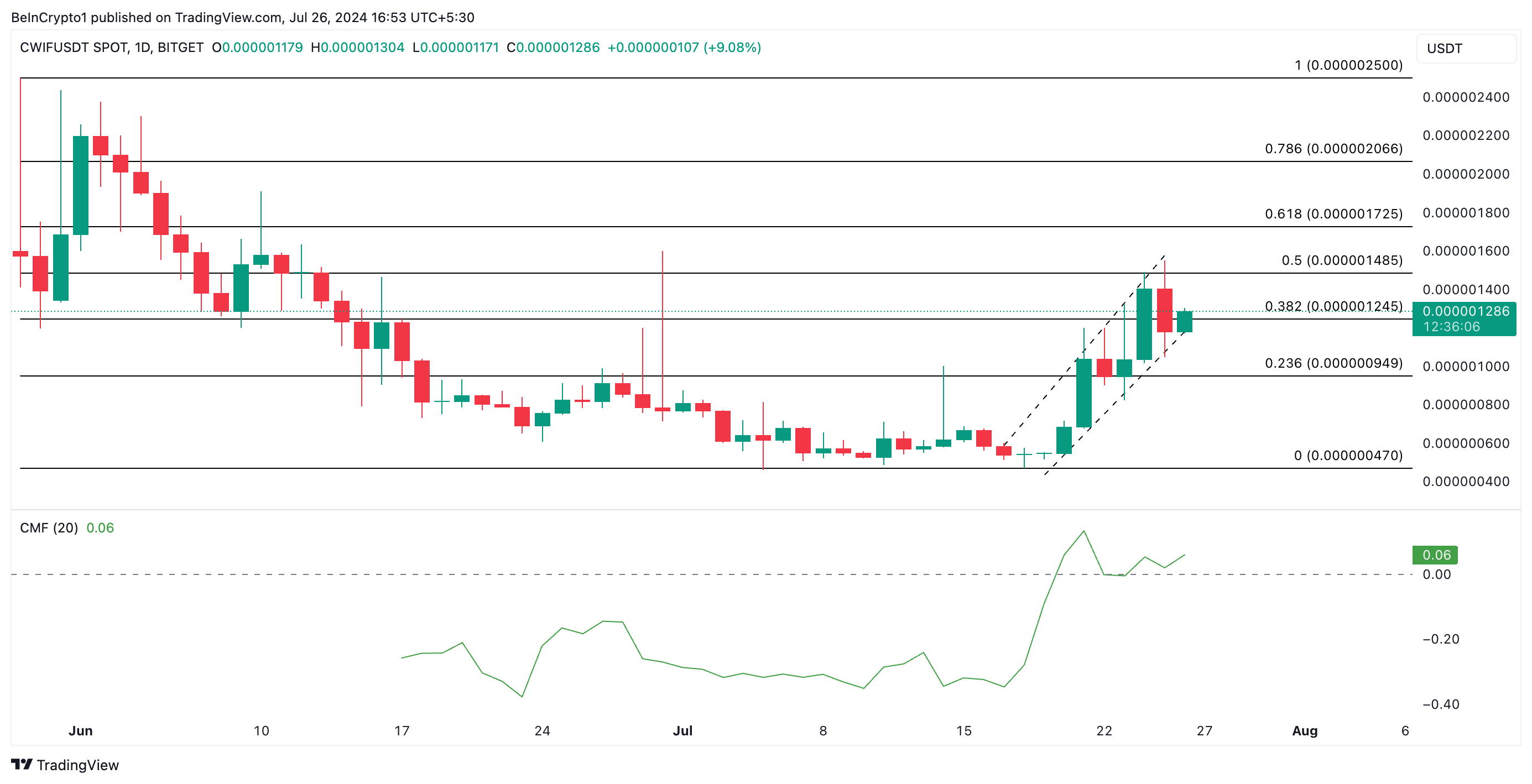 CWIF’s positive Chaikin Money Flow (CMF) indicates that the rally will continue. This indicator measures how money flows into and out of an asset. At 0.06 at press time, CWIF’s CMF signals liquidity inflow into the memecoin’s market.