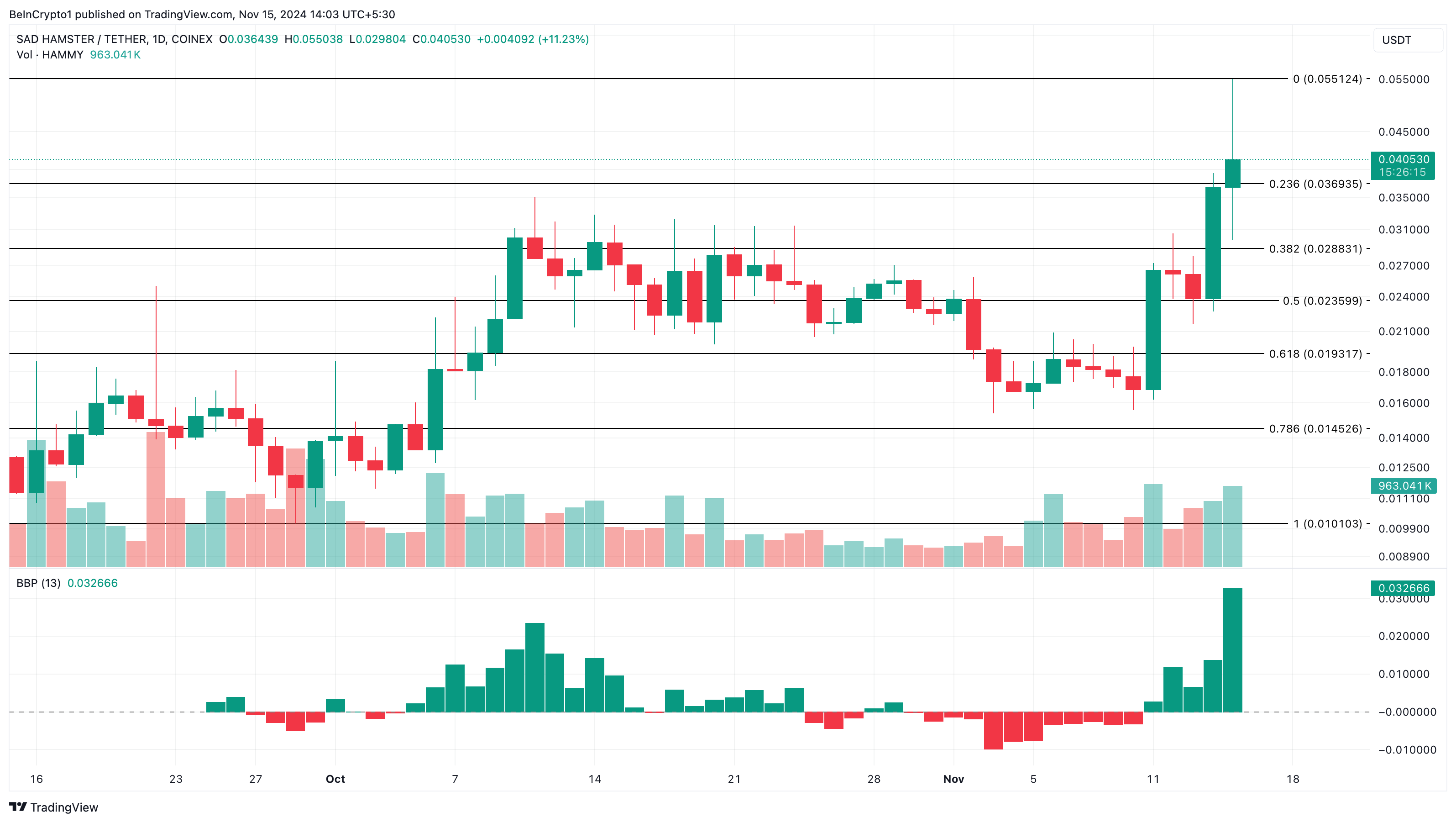 This development sparked a wave of buying pressure for HAMMY, which is $0.40 at press time. Further, the daily chart shows that the Bull Bear Power (BBP) has risen to the highest level since September.