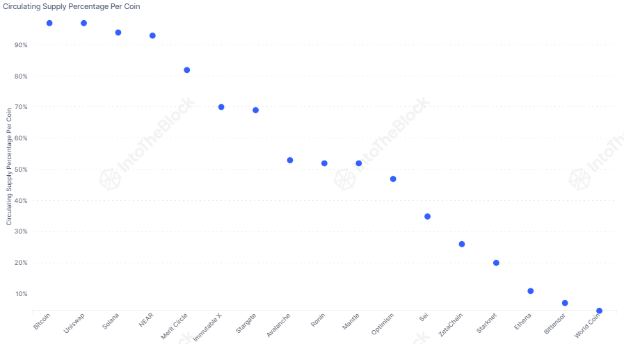 However, the type of unlock isn’t the only factor to consider. Another crucial aspect is the percentage of the total supply already available. When this percentage is very small, as with Worldcoin or Bittensor, market cap dilution can be significant.