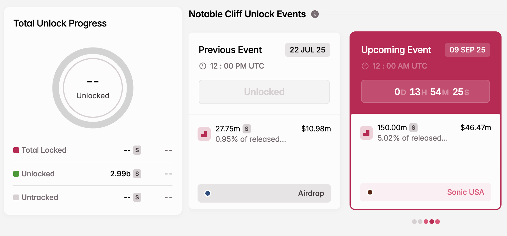 - Number of Tokens to be Unlocked: 150 million S (4.6% of Total Supply)
