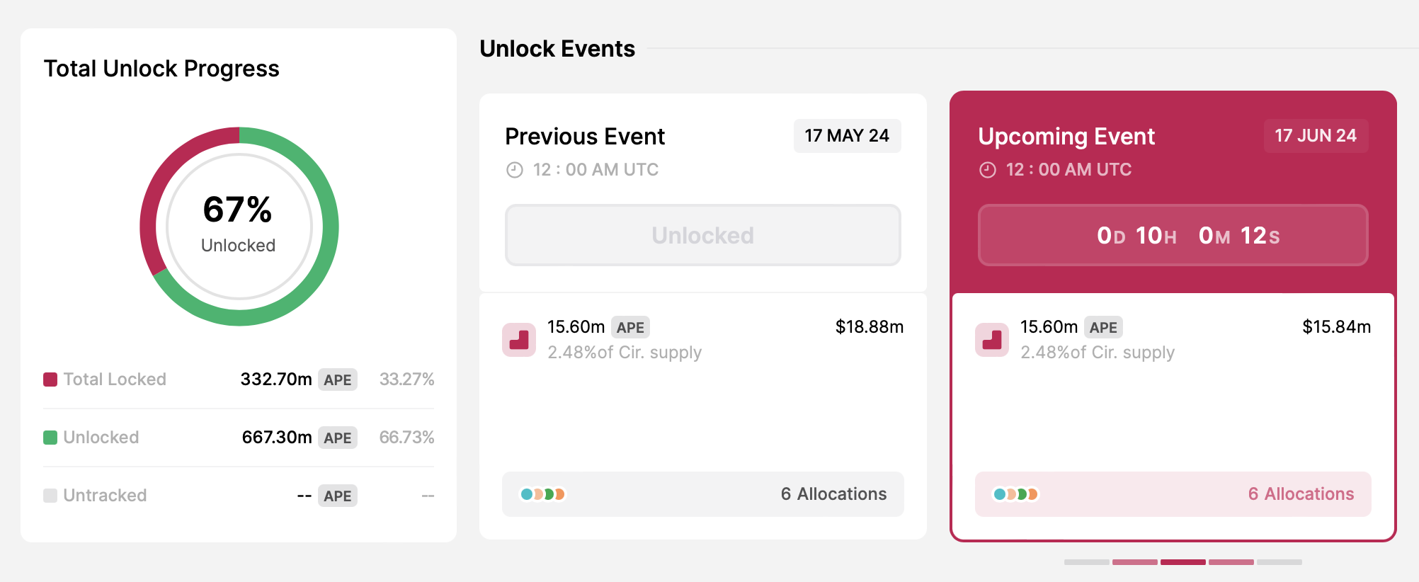 ApeCoin is the native token of Yuga Labs’ Ape ecosystem, which includes the popular Bored Ape Yacht Club (BAYC) NFT collection. On June 17, the project will unlock over 15 million coins and distribute them among the treasury, founders, team, and contributors.