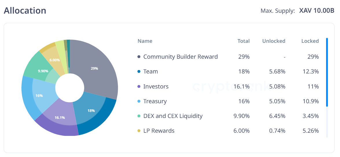 - Number of Tokens to be Unlocked: 313.29 Million XAV (3.13% of Total Supply)