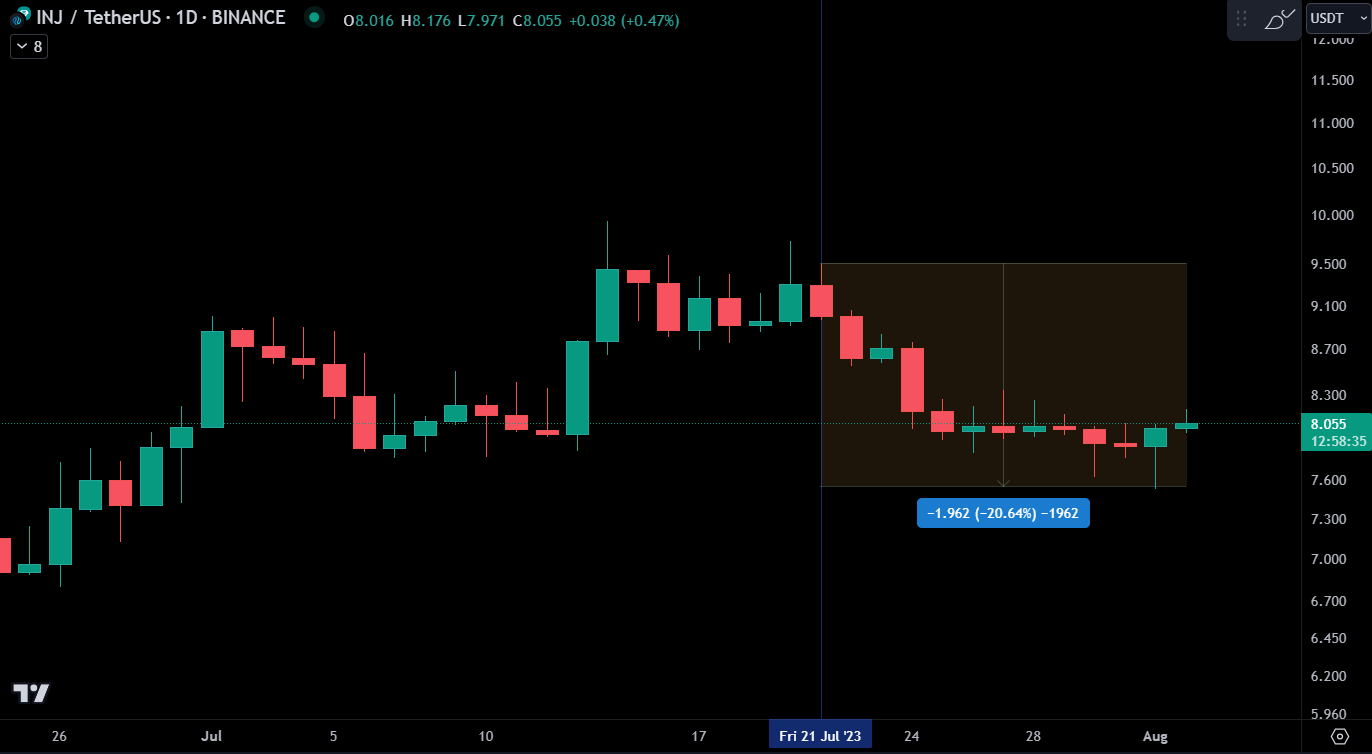 The INJ price consequently saw a 20% decline from its 21 July high of $9.50 to a one month low of $7.25 on 1 August. This is most likely due to large sell-offs from advisors and the team. With the team tokens making up 90% of the token unlock last month.