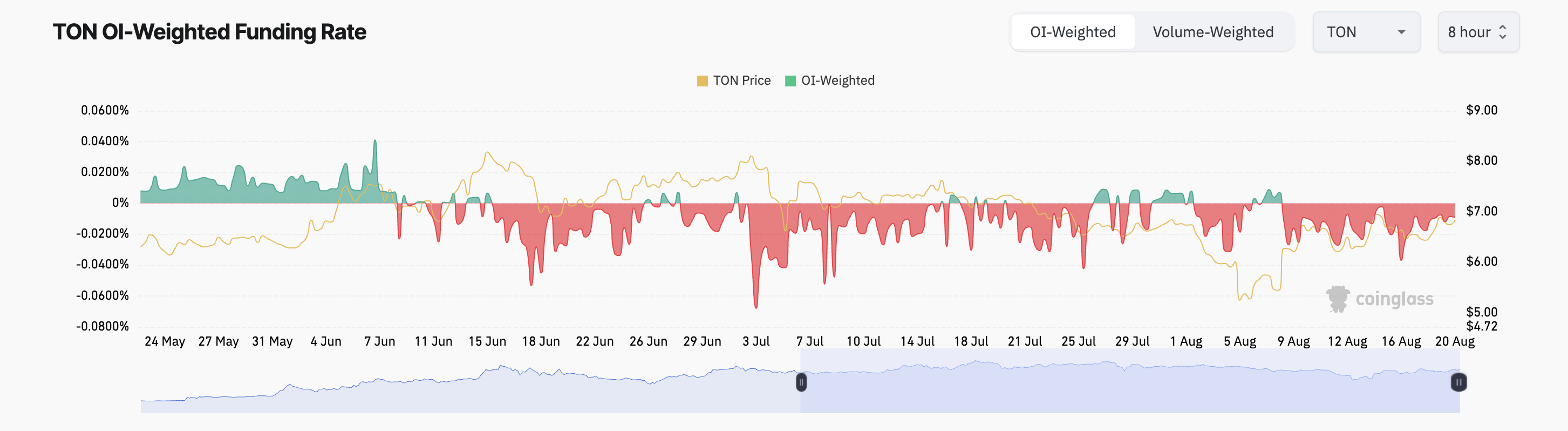 This bullish trend is missing from TON’s derivatives market as its futures traders continue to demand short positions. Coinglass’ data shows that the coin’s funding rate across cryptocurrency exchanges has been mostly negative since the beginning of the month.