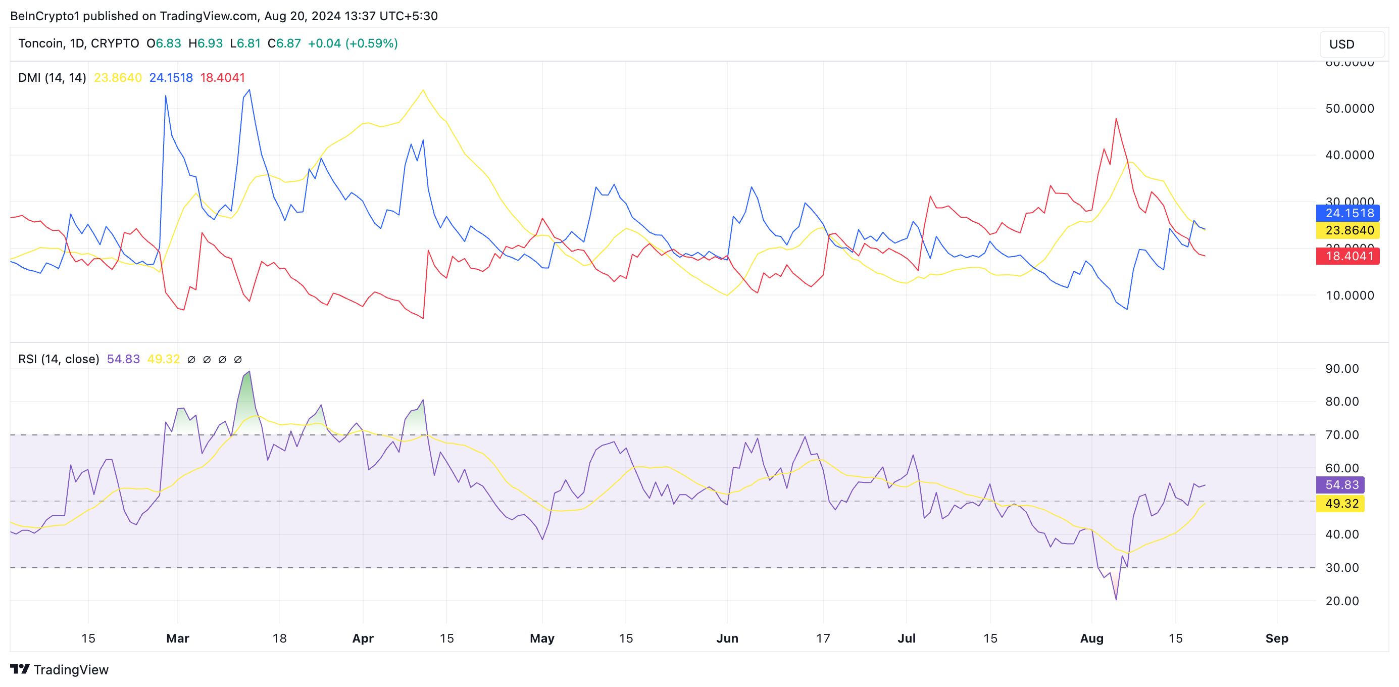 Despite the recent sell-offs, there remains significant demand for TON, as reflected by its rising Relative Strength Index (RSI). The RSI, which measures whether an asset is oversold or overbought, is trending upward at 54.83, indicating increased accumulation of the coin.