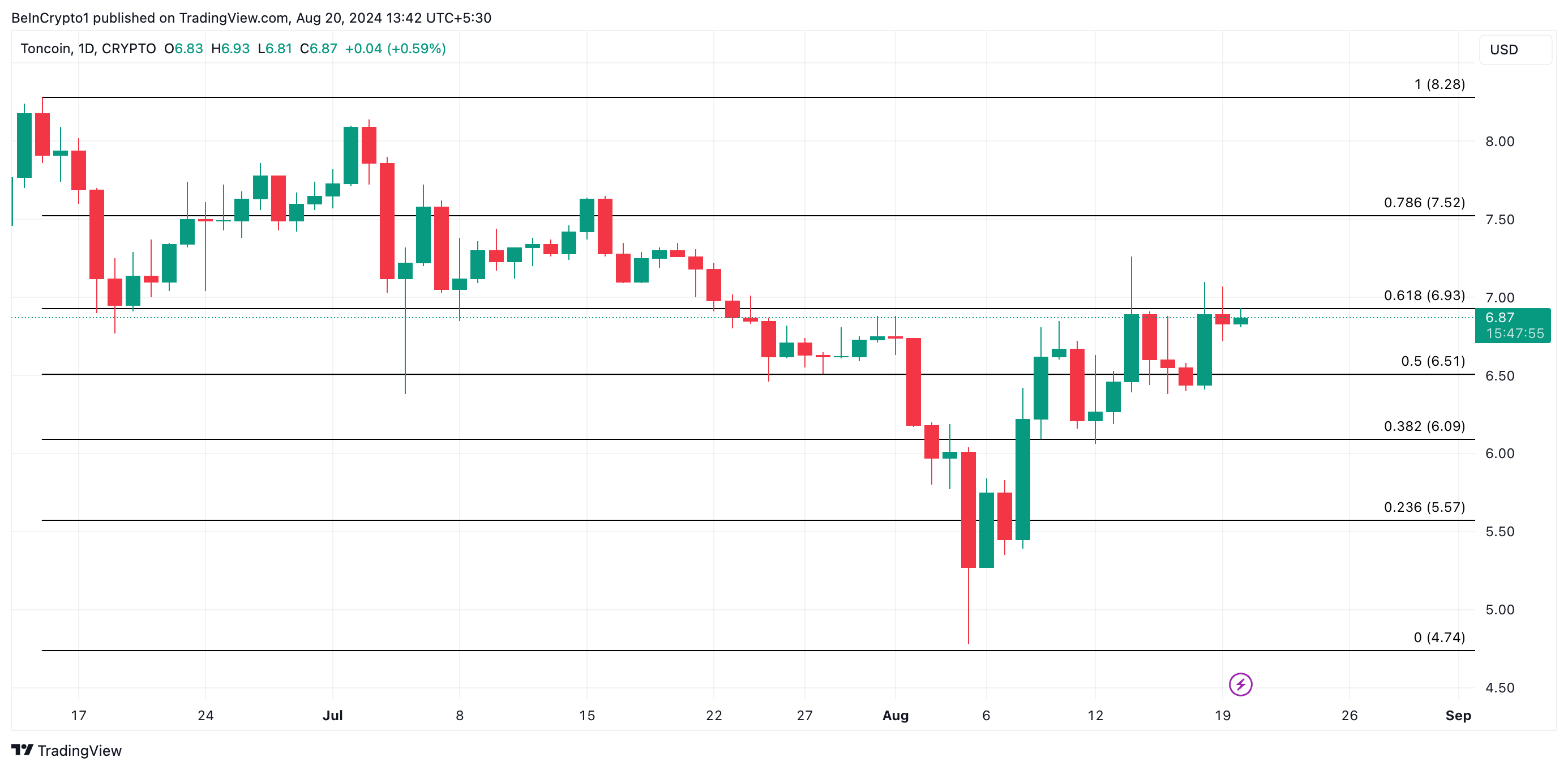 As of this writing, TON trades at $6.84. Readings from its daily chart reveal that the price dip is only temporary as the coin is still well positioned to resume its uptrend.