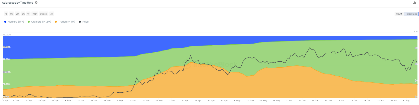 Sponsored“TON witnessed significant growth this year, growing from 3.6 million addresses with a balance in January to currently over 39.5 million. Due to this recent and rapid expansion, long-term holders now make up only 6% of all wallets. This surge in new users reflects increasing interest and adoption, but it also suggests that a majority of the network’s participants are still in the early stages of their involvement, which could influence the overall market dynamics and price stability moving forward,” Pellicer told BeInCrypto.