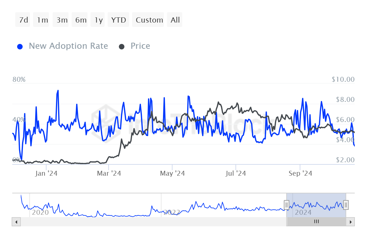 The adoption rate of Toncoin has dropped to a 10-month low of 18%, indicating a sharp decline in new investors joining the network. TON’s Adoption rate, measured by the formation of new addresses on the network, is a critical metric to gauge the health and growth of a blockchain project. A low adoption rate suggests that Toncoin is struggling to attract new users, which could affect its overall market performance.