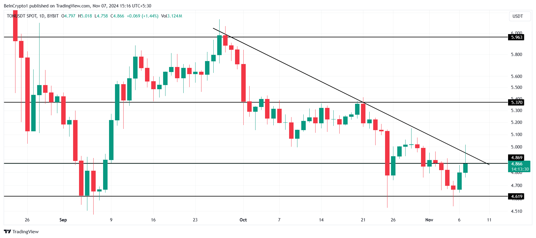 Toncoin’s price is attempting to flip the $4.86 resistance level into a support. Achieving this could help TON break out of its month-long downtrend, offering a path toward recovery. A successful breach would provide investors with hope for a rebound, but sustained buying power will be crucial.