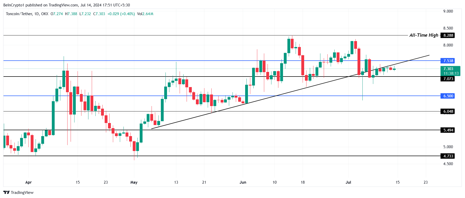 Toncoin’s price, trading at $7.30, is attempting to climb back above the uptrend line that has been under it since May. In doing so, TON would be able to breach and flip $7.53 into a support floor.