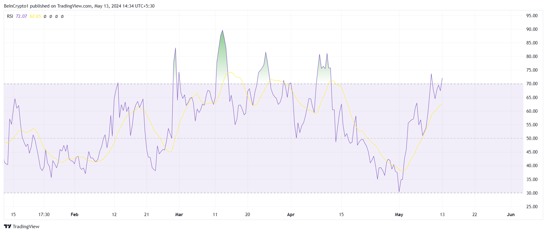 Based on this reading, TON is visibly in the overbought region, well above the threshold of 70.0. Historically, a breach into this zone is followed by correction as the market cools down. Although, the bullishness still continues for a day or two before the correction is initiated.