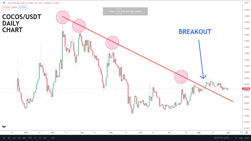 COCOS has been moving upwards since breaking out from a descending resistance line on July 14. However, it has failed to initiate a significant upward movement, since it is facing strong resistance at $0.90. So far, it has been rejected three times by the area. But if a breakout occurs, the token could increase all the way to $1.35 which is almost 100% higher than its current price.