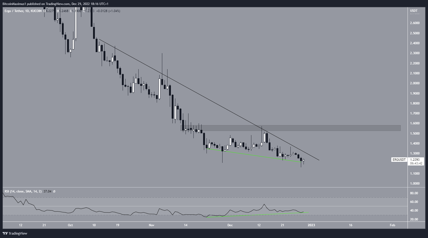 Ergo is a smart contract platform that aims to provide economic freedom to ordinary people through decentralized and accessible financial tools. Simply put, the Ergo platform delivers a simple way to implement financial contracts. On Jan. 9 at block height 1,200,000, the emissions per block will drop from 45 to 42. This is part of a gradually decreasing curve that will lead to block emissions of only 3 ERG at network height 1,760,000 The ERG price has been falling underneath a descending resistance line since Oct. 12 and is trading very close to an all-time low. However, there is also a massive bullish divergence that has developed in the daily RSI (green line). Such divergences often precede bullish trend reversals.
