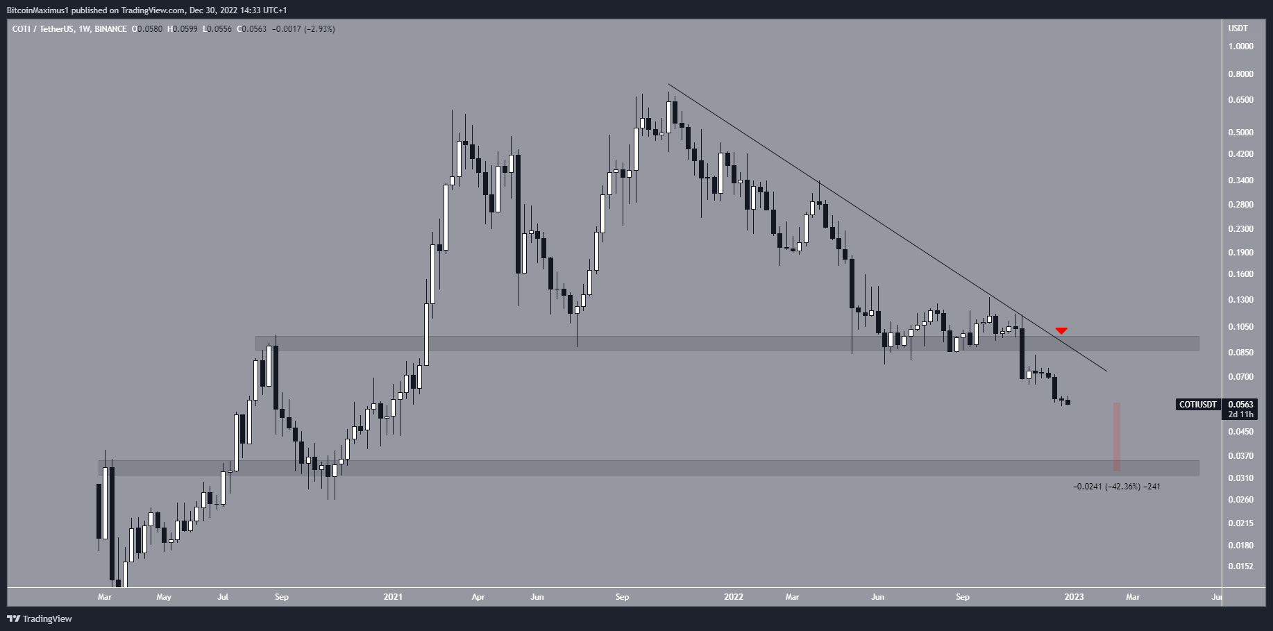 However, the COTI price action is still bearish. The COTI price broke down from the $0.095 area at the beginning of November and has decreased considerably since. Moreover, the next support area is at $0.034, a drop of 42% from the current price.