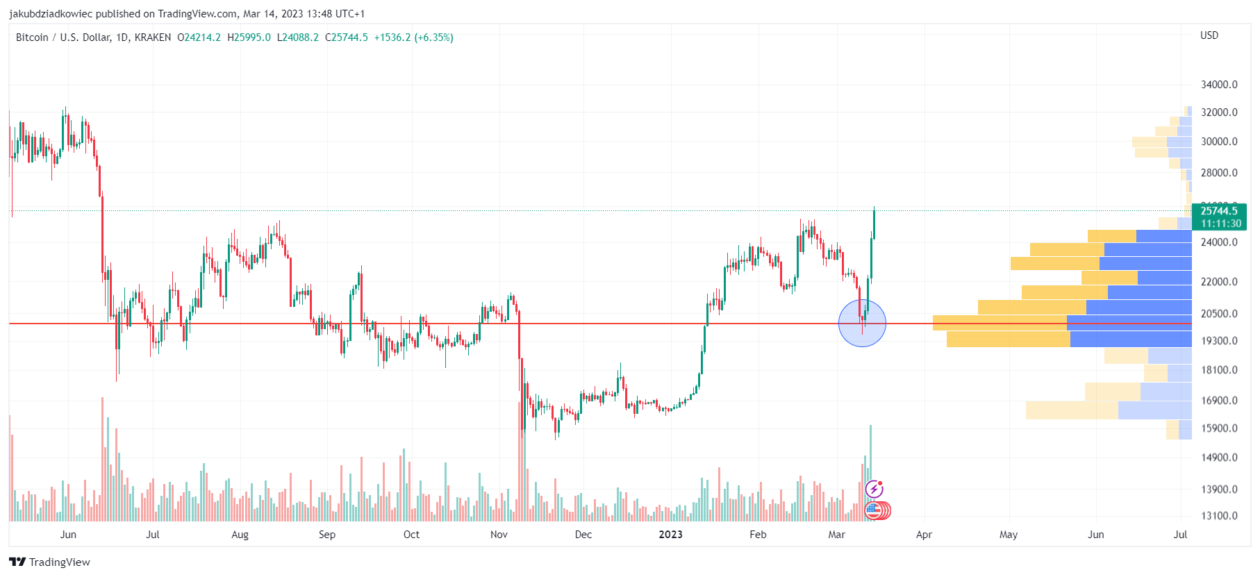 By applying the VPVR to a daily chart of the BTC price over the last nine months of accumulation, it turns out that the $20,000 level (red line) is again the most important. This is the area where most coins have changed hands. Therefore, it could be expected to serve as support (blue circle) after its reclaiming.