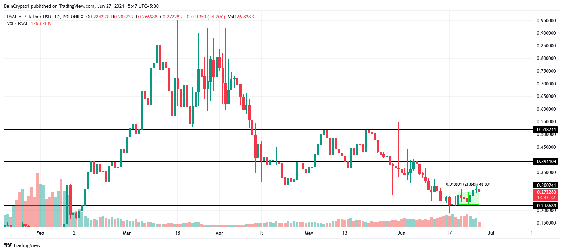 PAAL AI (PAAL) witnessed a 22% rise over the past week as the altcoin inched close to the barrier at $0.30. Trading at $0.27, PAAL could take a shot at reclaiming the losses noted since mid-May to the last week.