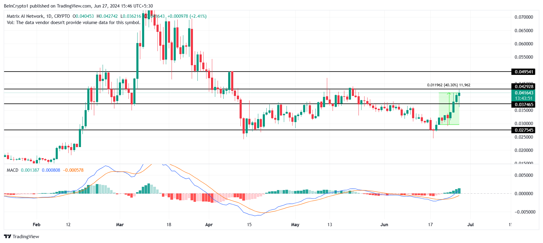 Matrix AI Network (MAN) price had a pretty good run this past week, rising by more than 40% in the span of a week. The AI token bounced back from the critical support at $0.027 to change hands at $0.041 at the time of writing.