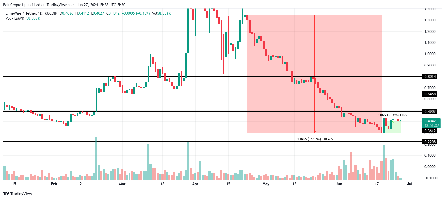 While LimeWire’s price rose 36% this week, impressing investors, it has barely escaped the massive crash noted by the altcoin. Throughout May and June, LMWR fell by more than 77%, bringing the price down from $1.3 to $0.34.