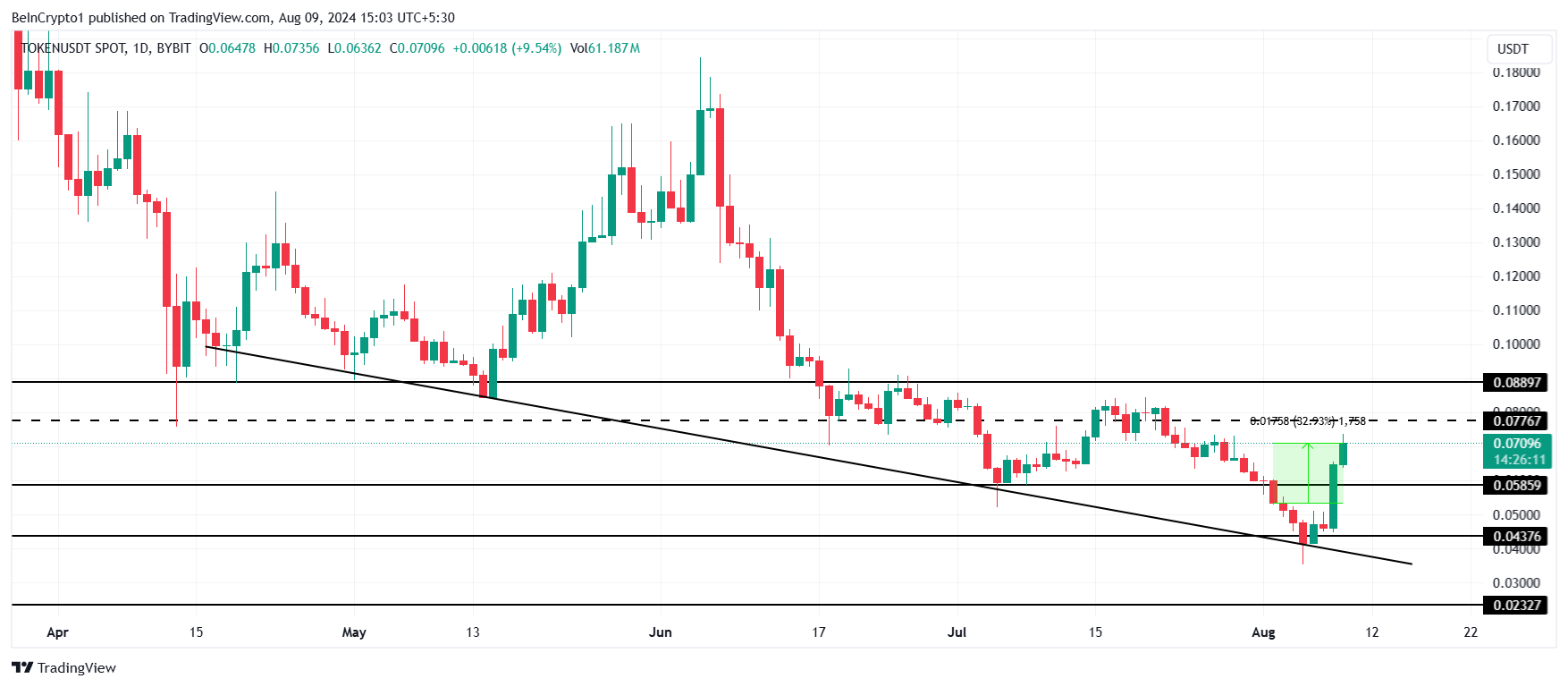 TokenFi ended its multi-week drawdown by rising significantly in the last four days, bringing the price to $0.070. After a volatile start of the week, TOKEN’s price is finally up 33%.