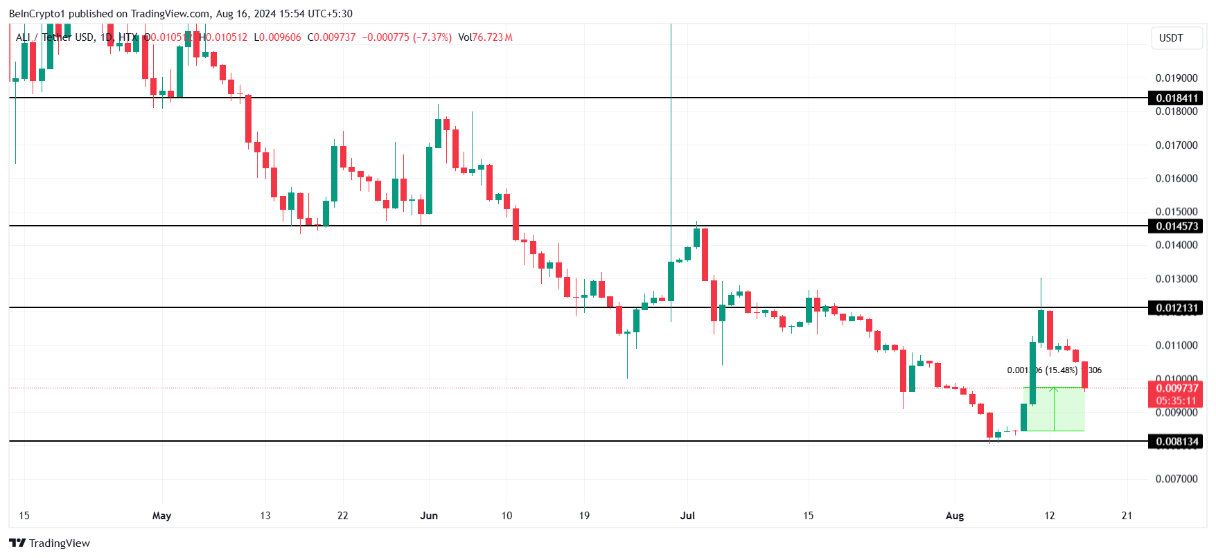 Leading the Artificial Intelligence token market, ALI emerged as the best-performing asset, noting a rise of 15.48%. Before the altcoin declined in the last three days, ALI was on track to breach the resistance at $0.012.