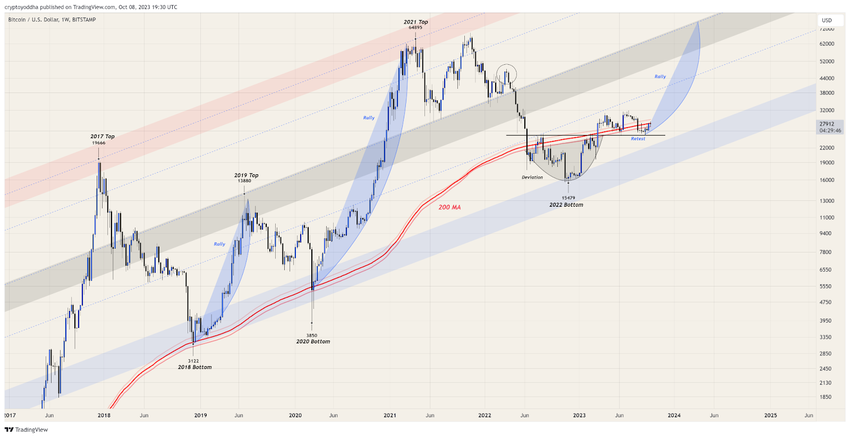 Sponsored SponsoredThe most significant part of @CryptoYoddha’s analysis is the fractal similarity with the previous cycle. Unlike previous analysts, he contends that the first phase of the upside, expected to occur even before the halving, will already push past the all-time high (ATH).