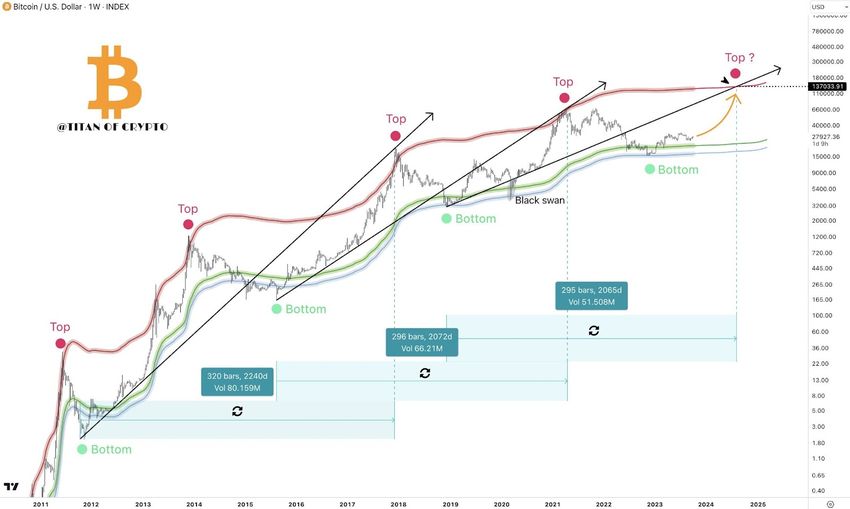 After that – based on the similarity with the previous cycle – a correction and a possible black swan would be expected. The final Bitcoin price peak prediction in his analysis remains outside the published charts.