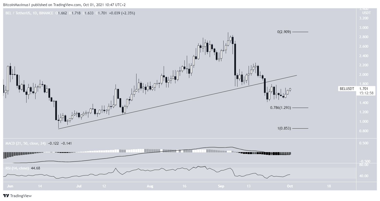 BEL has been moving downwards since Sept 4. It broke down from an ascending support line on Sept 20 and is now approaching the $1.30 support area, created by the 0.786 Fib retracement support level. The MACD and RSI are starting to show bullish signals.