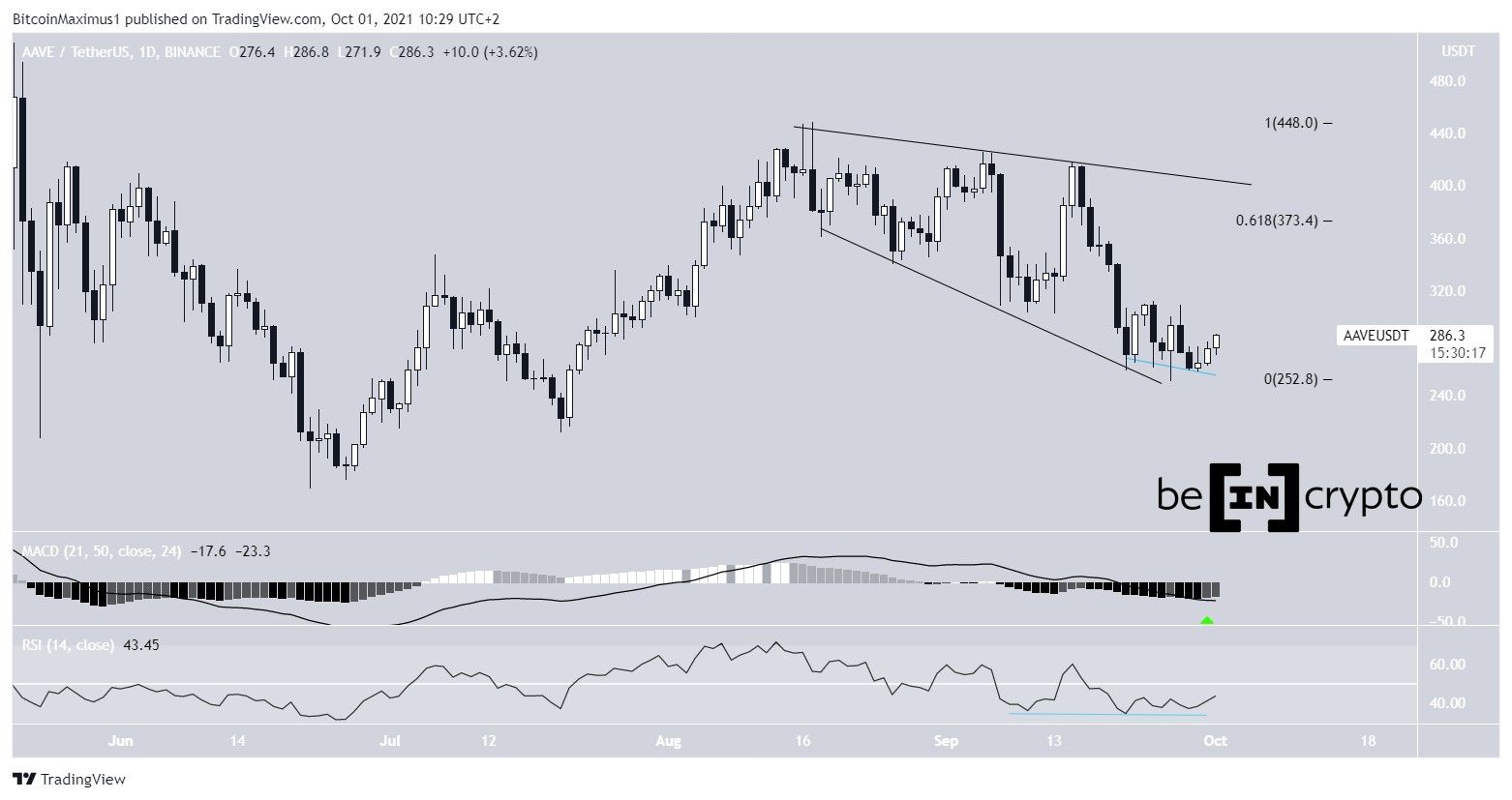 AAVE has been trading inside a descending broadening wedge since Sept 7. This is normally considered a bullish pattern.