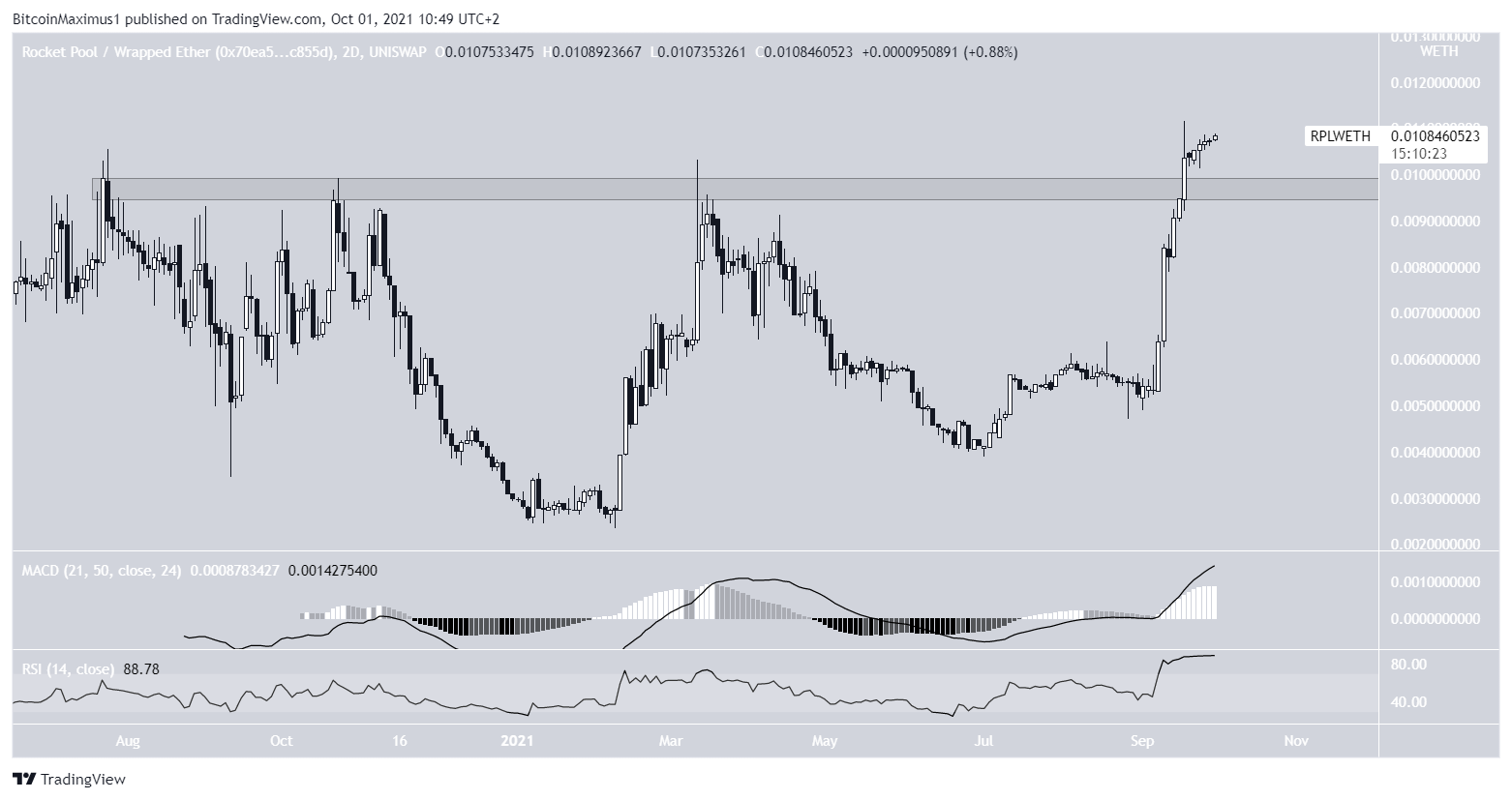 The RPL/ETH pair has just broken out and moved above the 0.01 ETH resistance area.