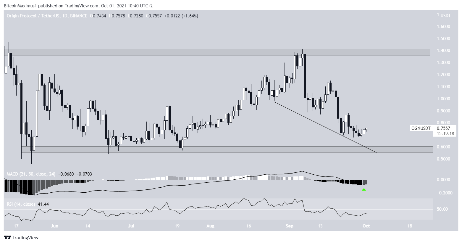 OGN has been trading in a range between $0.58 and $1.40 since May. It was rejected by the resistance area on Sept 6 and has been moving downwards since.