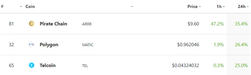 Following a strong weekend in the crypto markets, Pirate Chain (ARRR), Polygon (MATIC) and Telcoin (TEL) all saw the biggest gains within the top 100 cryptocurrencies.