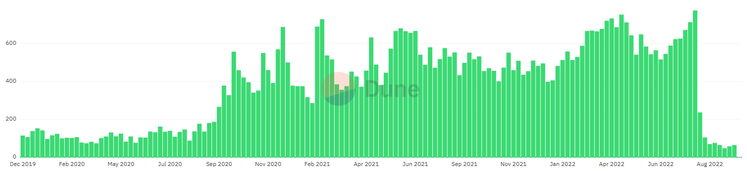 Tornado Cash is taking a tumble in terms of activity as a result of the sanctions imposed by the United States Treasury. Data from Dune shows a significant drop in unique users per week since the announcement of the sanctions in August 2022, with September seeing unique users well below 100.