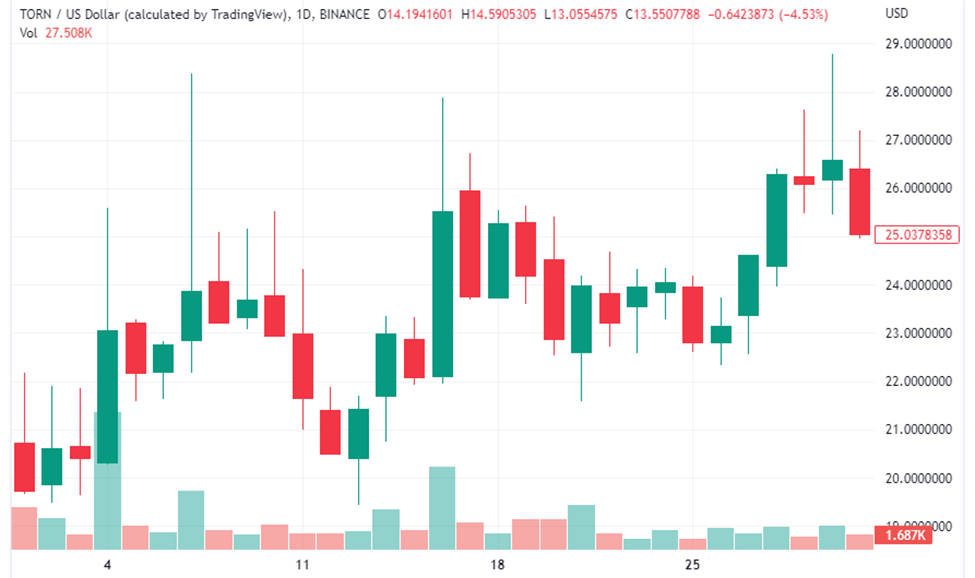 TORN opened on July 1, with a trading price of $20.73, reached a monthly high of $28.38, tested a monthly low of $19.56, and closed the month at $25.09. Overall, there was a 21% increase between the opening and closing price of TORN in July.