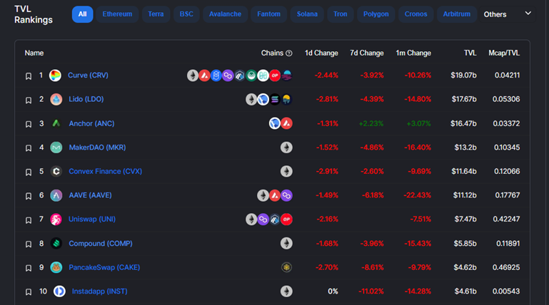 Convex Finance (CVX), Uniswap (UNI), PancakeSwap (CAKE), and Instadapp (INST) all witnessed declines in TVL as well. Losing $660M, $170M, $230M, and $770M respectively.