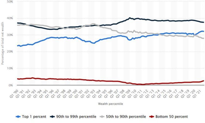 The chart shows the wealth distribution in the US, where the richest 10 percent of all people (blue and black lines) hold over 70 percent of total wealth. It becomes even more curious when we use global figures: