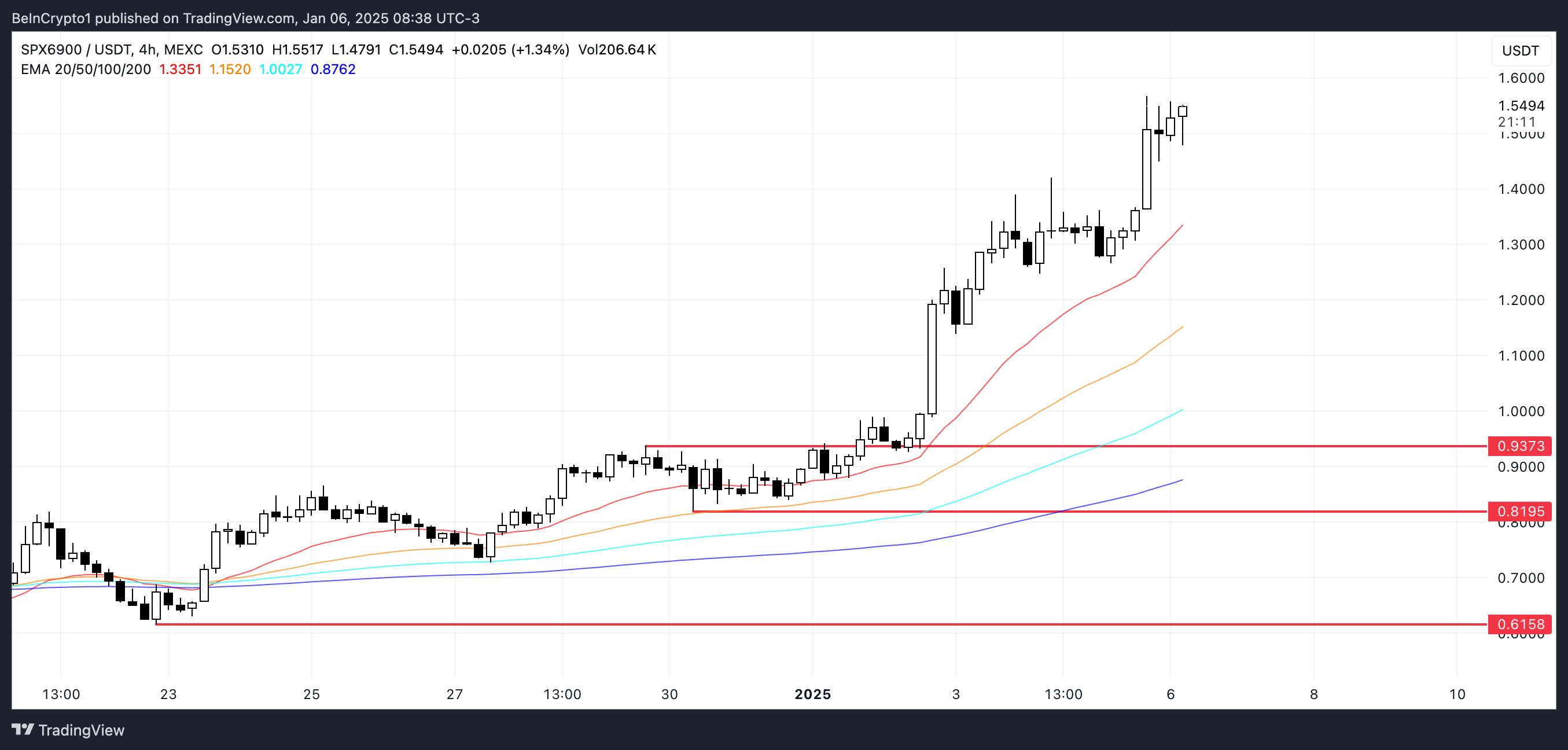 A correction remains possible, given SPX’s 71% rise over the past week. If selling pressure increases, SPX could test the strong support at $0.93. Further declines could push the price down to $0.81 or even $0.61, depending on the strength of the correction.