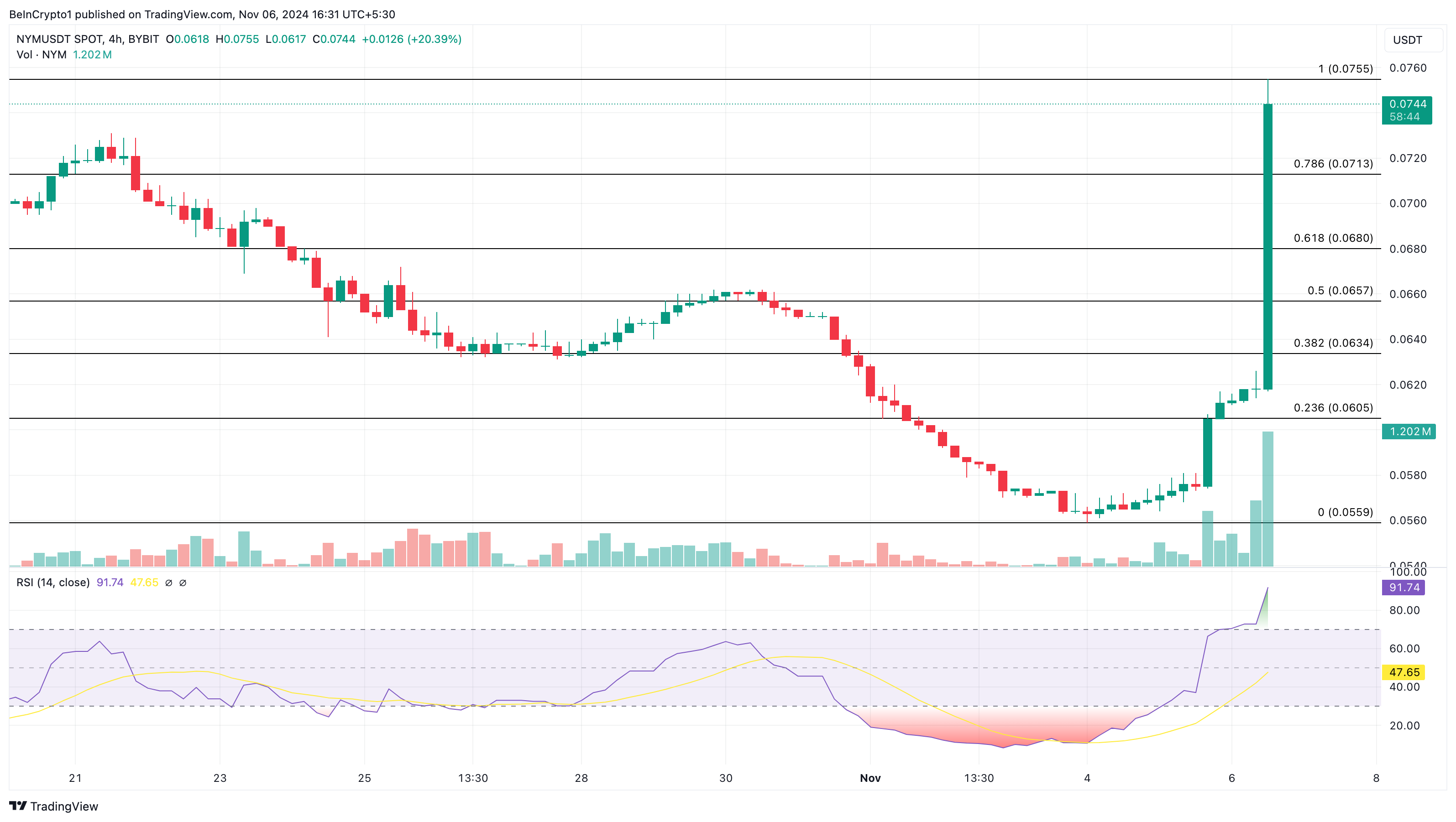 As of this writing, NYM’s price is $0.075. However, on the daily chart, the Relative Strength Index (RSI) has hit 91.79. The RSI measures momentum and shows if an asset is overbought or oversold.