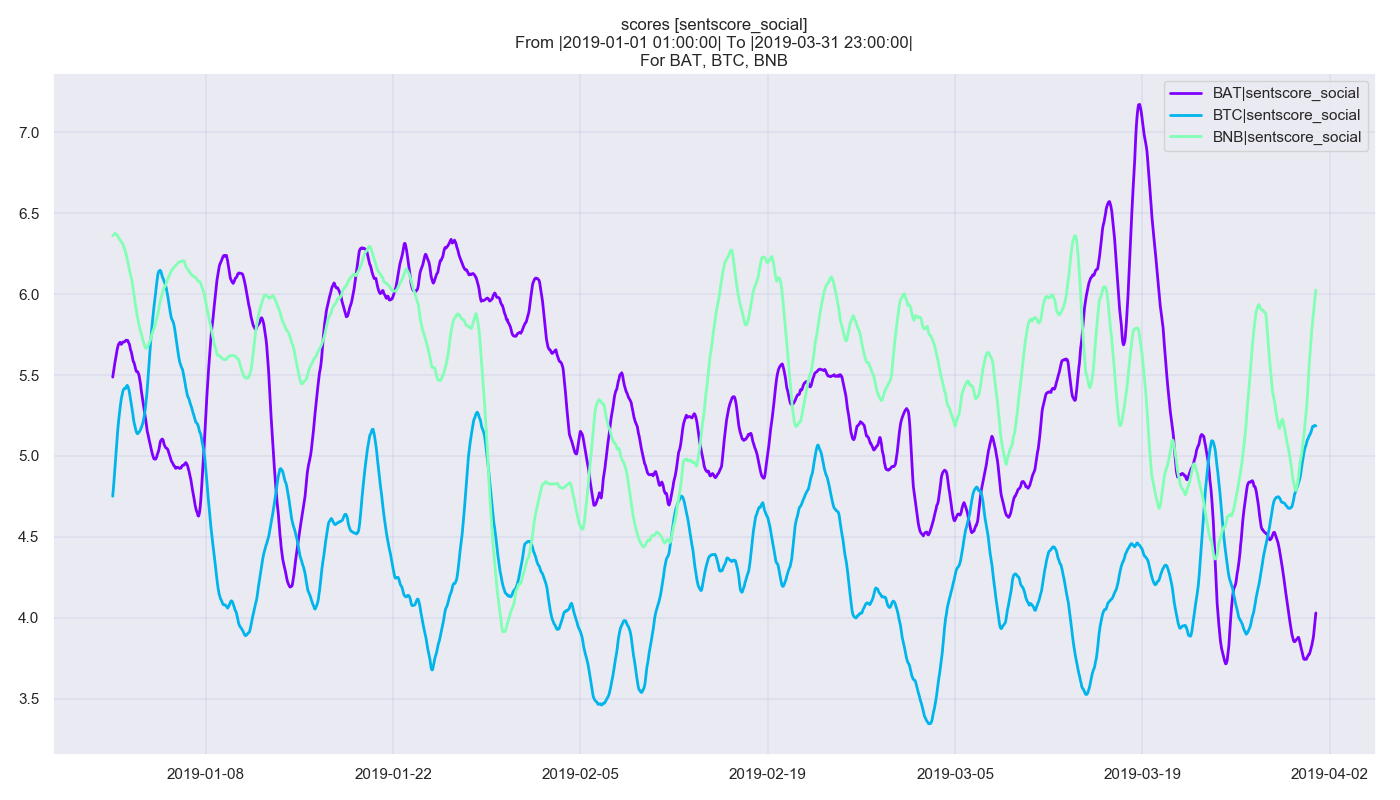 Looking at the above chart, we see that both BNB and BAT have clearly developed better sentiment than BTC during this time, with both regularly jumping into the positive zone (6.0+) — while BTC remained relatively muted, with a sentiment score often dipping below four.