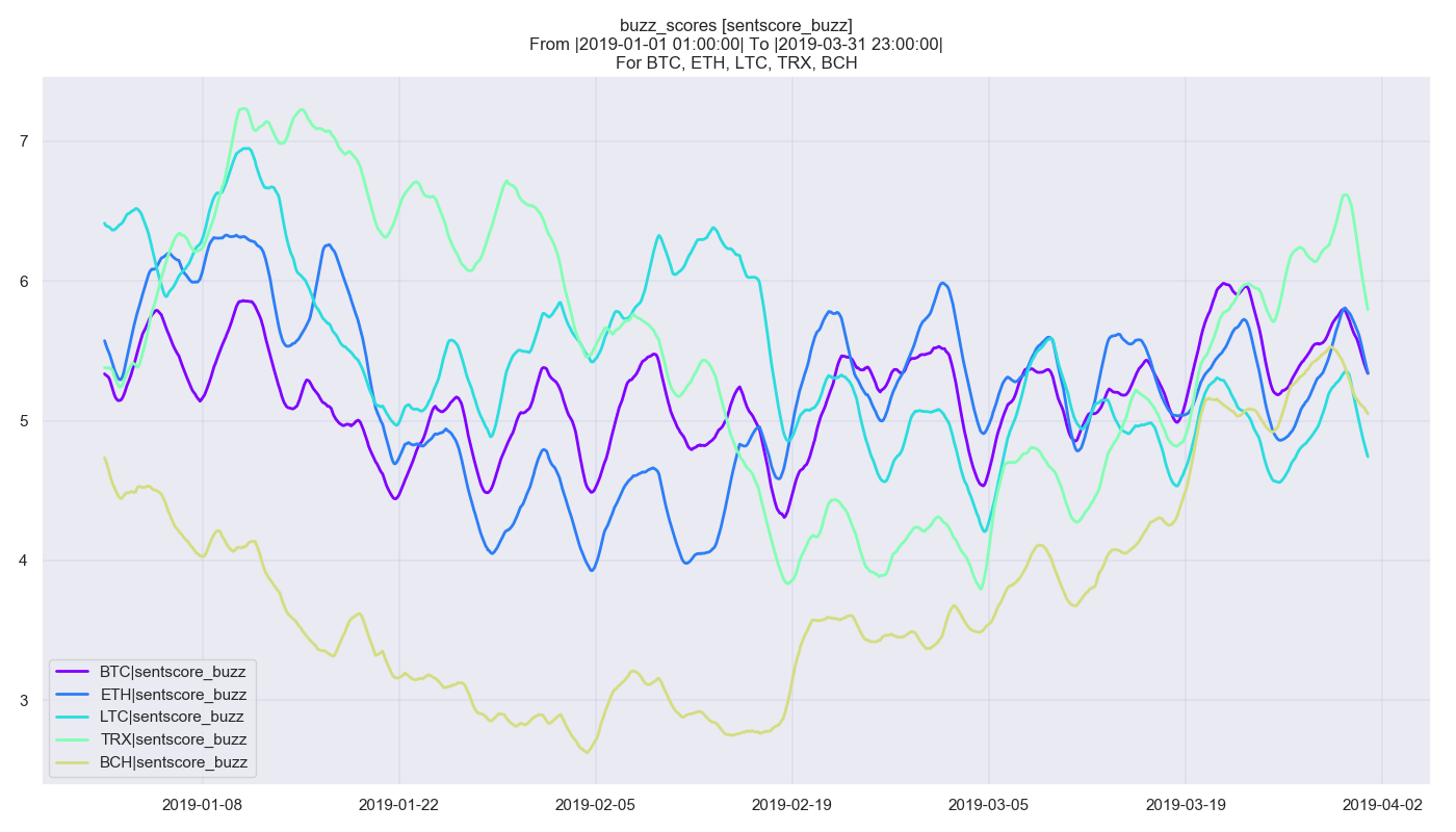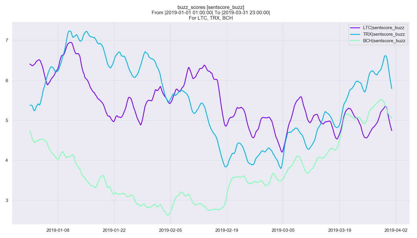Using Bitcoin (BTC) as the baseline (shown in purple), we see that both TRON (TRX) and Litecoin (LTC) regularly maintained a buzz score higher than the market leader, with TRON (shown in green) seeing significantly increased buzz during January and February before dropping off in March, only to pick back up in April. Litecoin (shown in light blue), on the other hand, steadily maintained its buzz score above Bitcoin — with its buzz score hitting above six on two occasions.