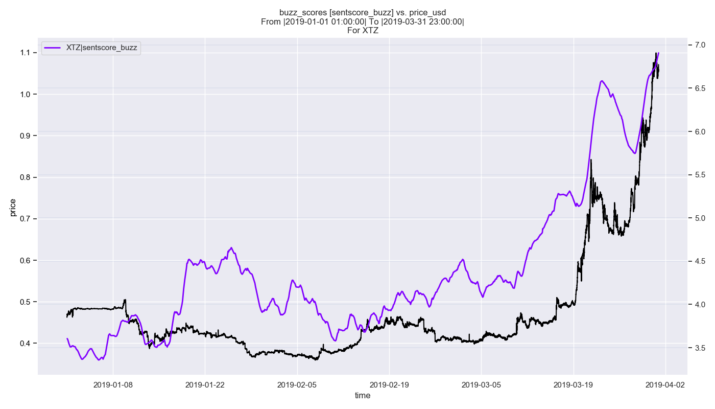 Unsurprisingly, this huge positive surge in buzz was accompanied by similarly positive market movements, with the growing buzz score almost perfectly matching the price growth seen by XTZ during this time-frame. This can be seen beginning in March, a month in which the buzz score spiked twice, with each spike preceding a similarly large spike in XTZ value.