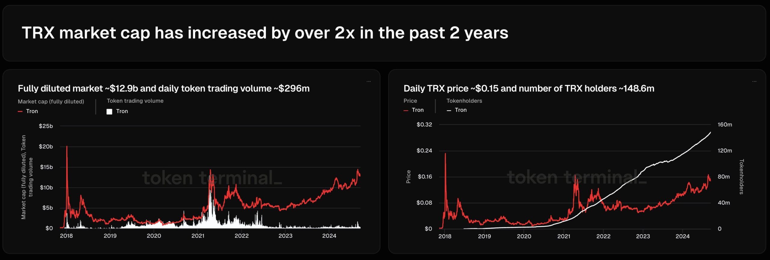 TRON’s native token, TRX, has also experienced impressive growth. Token Terminal reported that over the past two years, TRX’s market capitalization has more than doubled.