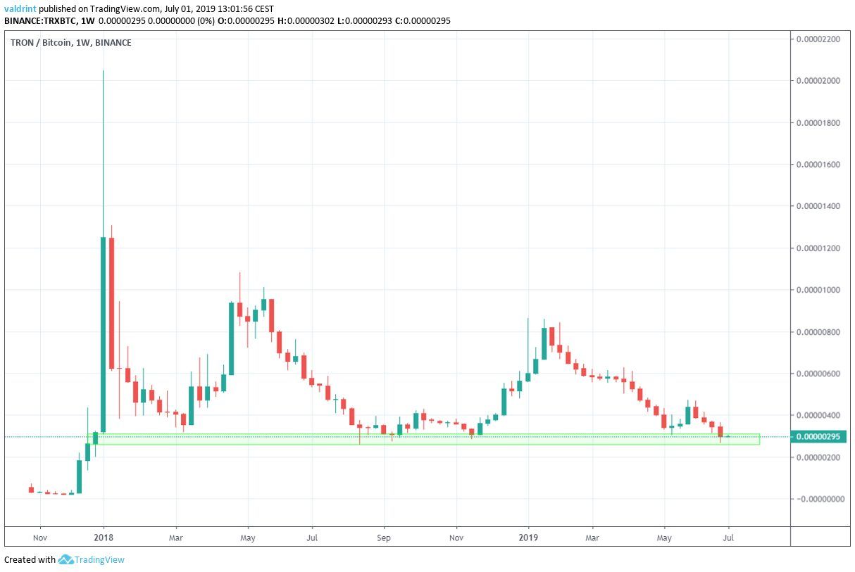 The price of TRX has fallen to a major support area. We have not seen lower prices since the beginning of 2018.