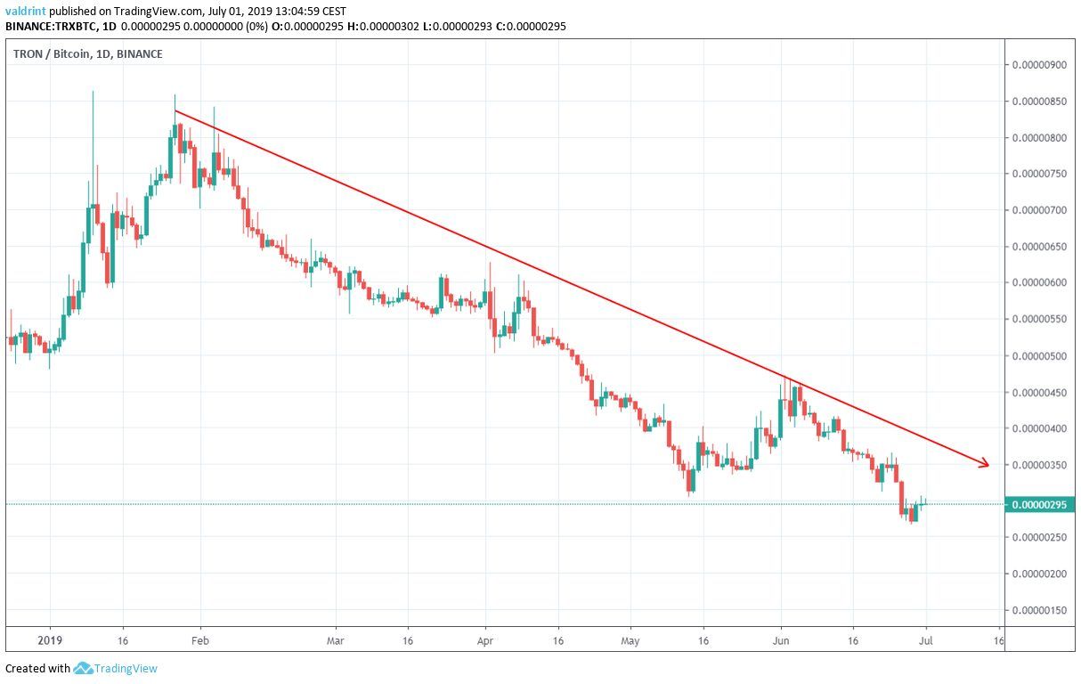 Since the beginning of 2018, the price of Tron (TRX) has been fluctuating wildly. Highs of 2000, 1000 and 850 satoshis were reached on January, May and December 2018.