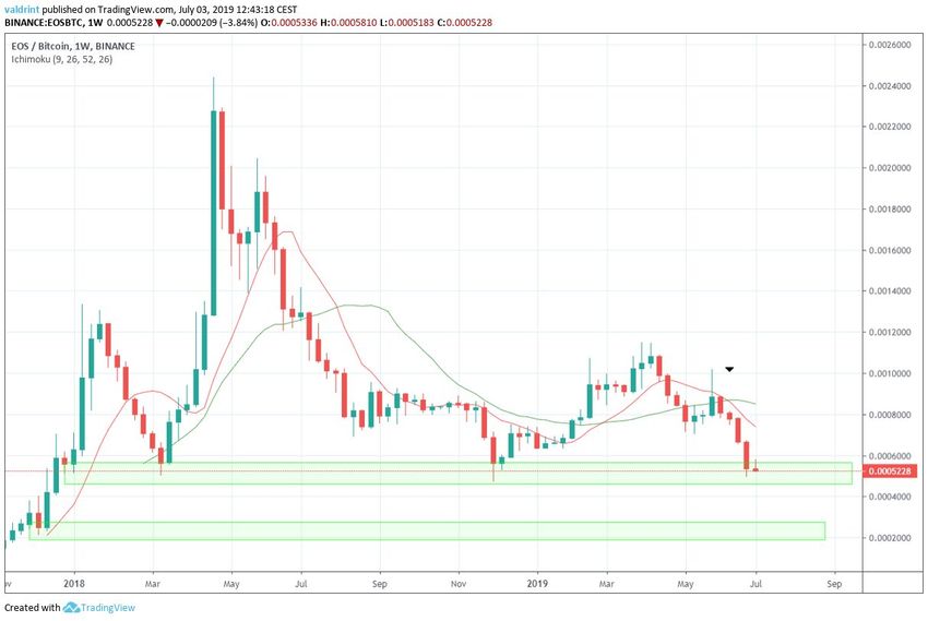 While it is not following any support line, the price is trading inside the long-term support area between 290 and 300 satoshis.