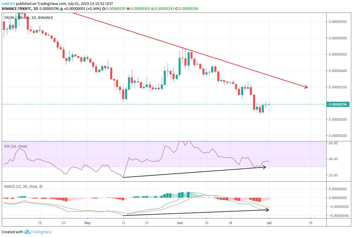 But, as stated above, the TRX price is not following a long-term support line, making the use of this divergence trickier — especially if looking to initiate a trade.