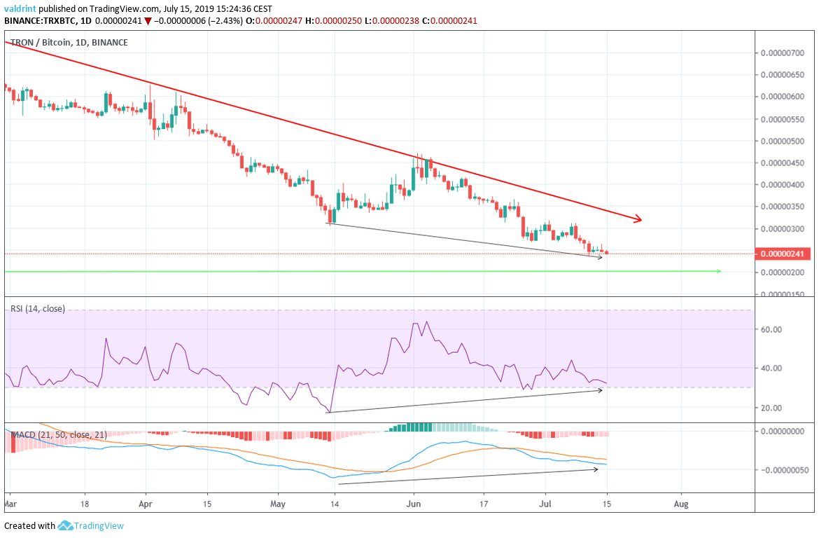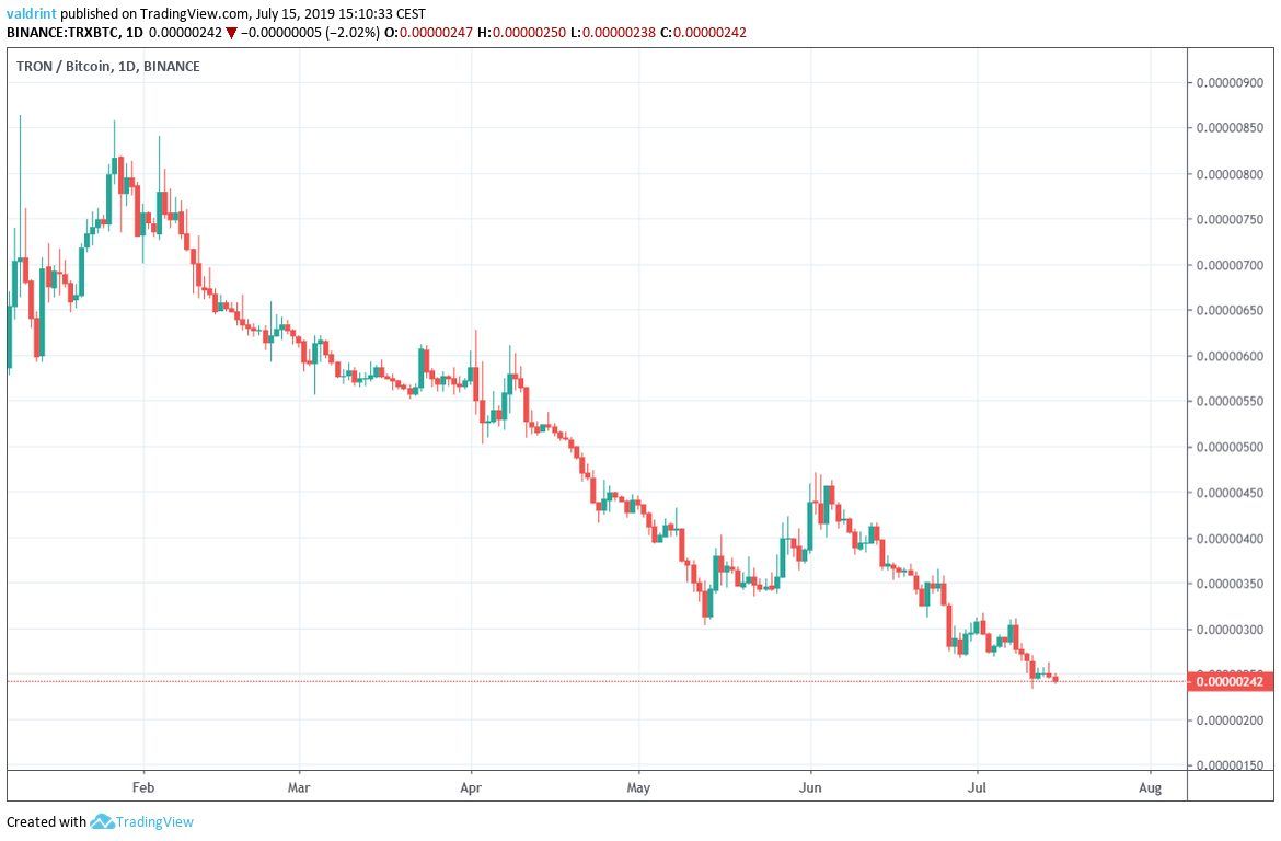 A look at the weekly time-frame shows that in August 2018, the TRX price made a low near 300 satoshis.