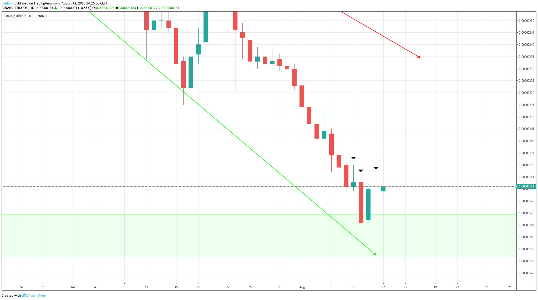 A look at the daily time-frame shows that the TRX price has just reached a minor support area and is above the other significant support area.
